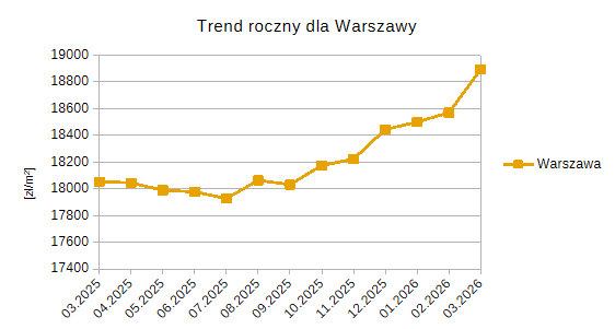 Warszawa niezmiennie pozostaje najdroższym miastem w Polsce. W marcu 2026 roku średnia cena ofertowa wynosi 18 894 zł/m², co oznacza wzrost o ok. 4,7% rok do roku. Dla porównania, rok wcześniej, w marcu 2025, ceny oscylowały wokół 18 052 zł/m².