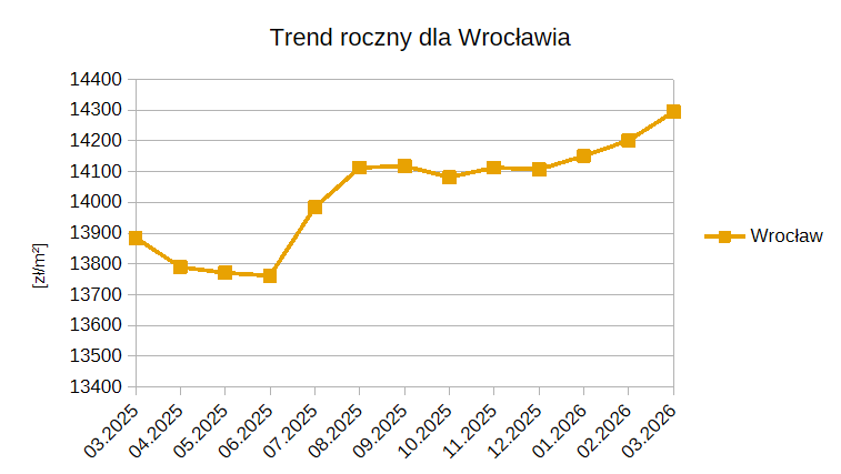 Wrocław w marcu 2026 to 14 294 zł/m², wzrost o ok. 3% rok do roku. Rok nie był jednak równy - wiosna 2025 przyniosła korektę cenową, po której latem nastąpił gwałtowne odbicie. Od sierpnia 2025 rynek stabilizuje się na poziomie powyżej 14 100 zł/m², a pierwsze miesiące 2026 przynoszą kolejną falę wzrostów.