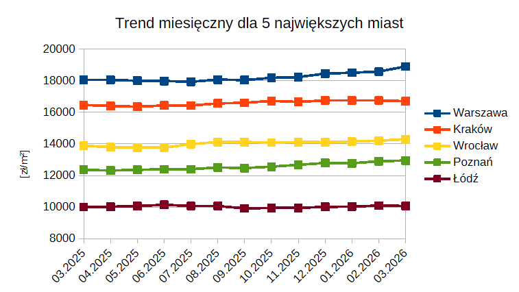 - Warszawa pozostaje najdroższa - 18 894 zł/m² w marcu 2026 (+4,7% r/r). Łódź najtańsza - 10 073 zł/m² (+0,6% r/r). Różnica między miastami to prawie 9 000 zł na każdym metrze.