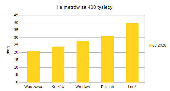 - Za 400 000 zł kupisz ~21 m² w Warszawie lub ~40 m² w Łodzi, niemal dwukrotna różnica przy tym samym budżecie.