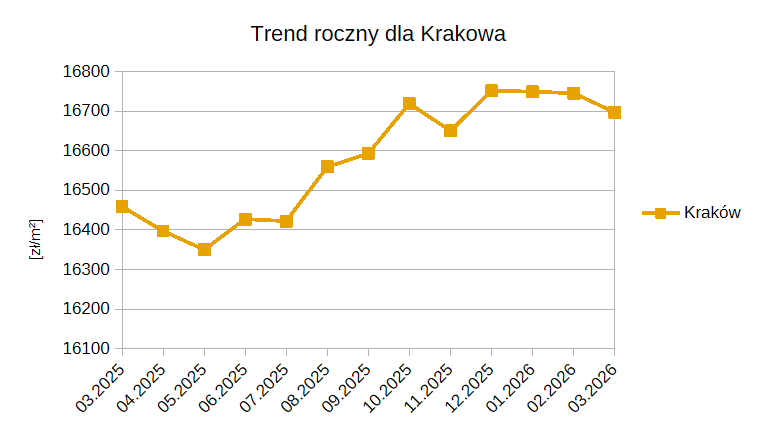Kraków od lat plasuje się tuż za Warszawą w rankingu cen. Marzec 2026 to 16 698 zł/m², a zmiana rok do roku jest najsłabsza w zestawieniu - zaledwie +1,5%. Co więcej, po szczycie z jesieni 2025 (okolice 16 750 zł/m²) ceny lekko się cofnęły, co może sugerować, że rynek dotarł do punktu, w którym popyt zaczyna reagować na poziom cenowy.