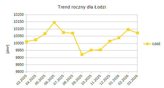Łódź to zdecydowanie najtańsze miasto w zestawieniu - 10 073 zł/m² w marcu 2026. Zmiana rok do roku to zaledwie +0,6%, jednak za tą liczbą kryje się rok sporych wahań, od szczytu ok. 10 150 zł/m² latem 2025, przez dołek poniżej 9 950 zł/m² jesienią, aż po powrót powyżej 10 000 zł/m² na początku 2026. Rynek łódzki jest więc bardziej zmienny niż sugeruje końcowy wynik. Dla kupującego z ograniczonym budżetem pozostaje jednak argumentem, za 400 000 zł można tu kupić ok. 40 m², co w żadnym innym dużym mieście nie jest możliwe.