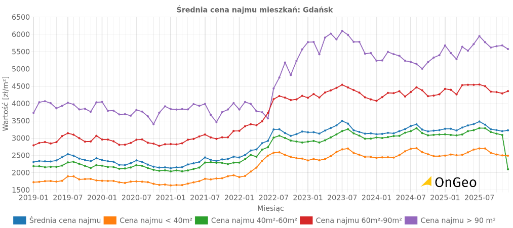 Raport o terenie OnGeo.pl zawiera średnie ceny najmu mieszkań w danym mieście.