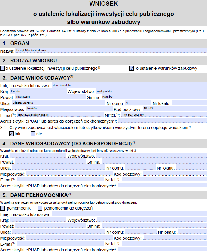 Poniżej prezentujemy wypełniony wniosek o ustalenie warunków zabudowy. Szablon wniosku został pobrany ze strony gov, właściwy link do wzoru dokumentu znajduje się w dalszej części artykułu. Jeżeli nie wiesz jak wypełnić wniosek o warunki zabudowy zapoznaj się z poniższym przykładem.