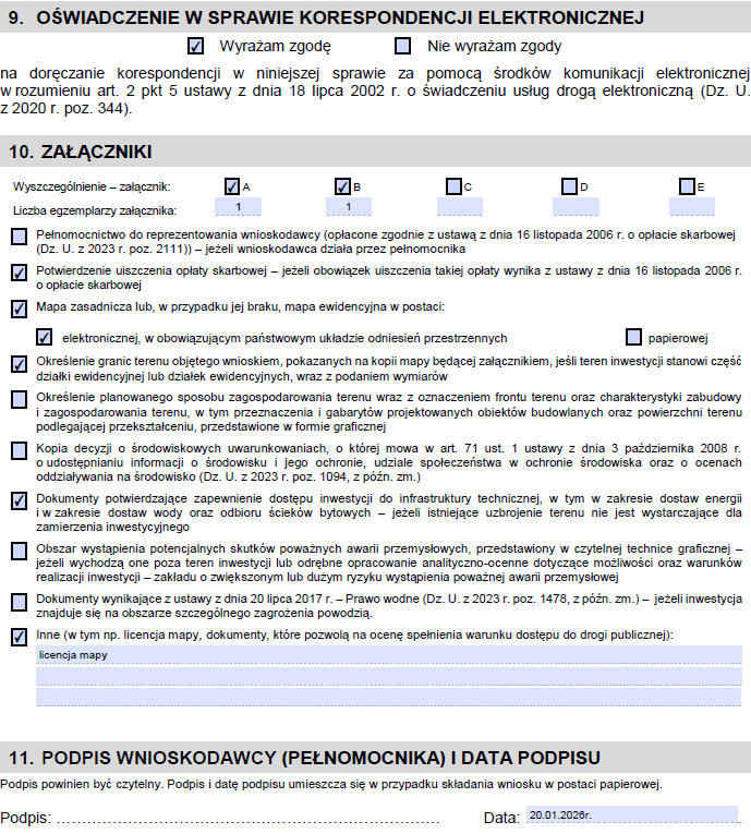 - druga kopia - mapa powinna zawierać planowane położenie inwestycji, wjazd na jej teren, oznaczenie granic terenu objętego wnioskiem oraz planowane zagospodarowanie terenu,