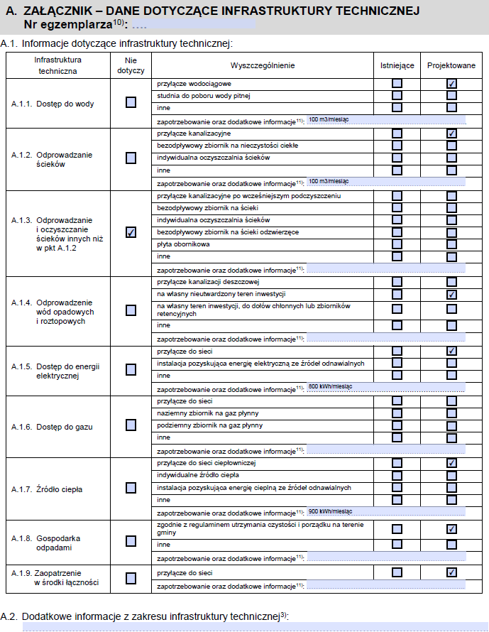 - zapotrzebowanie w zakresie infrastruktury technicznej: woda, energia elektryczna, gaz, centralne ogrzewanie, odprowadzanie lub oczyszczanie ścieków, unieszkodliwianie odpadów,