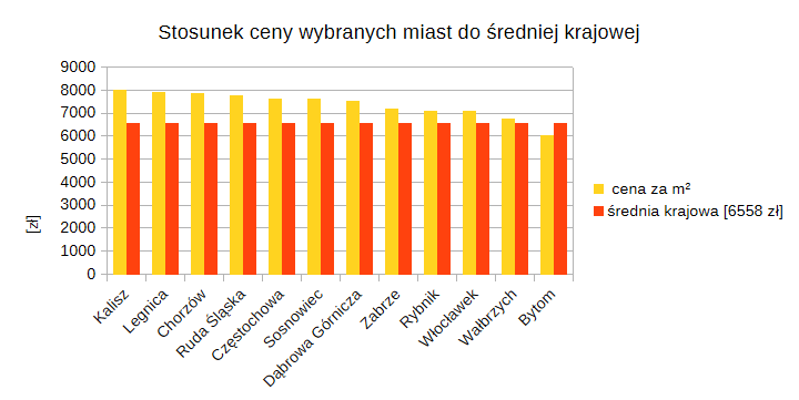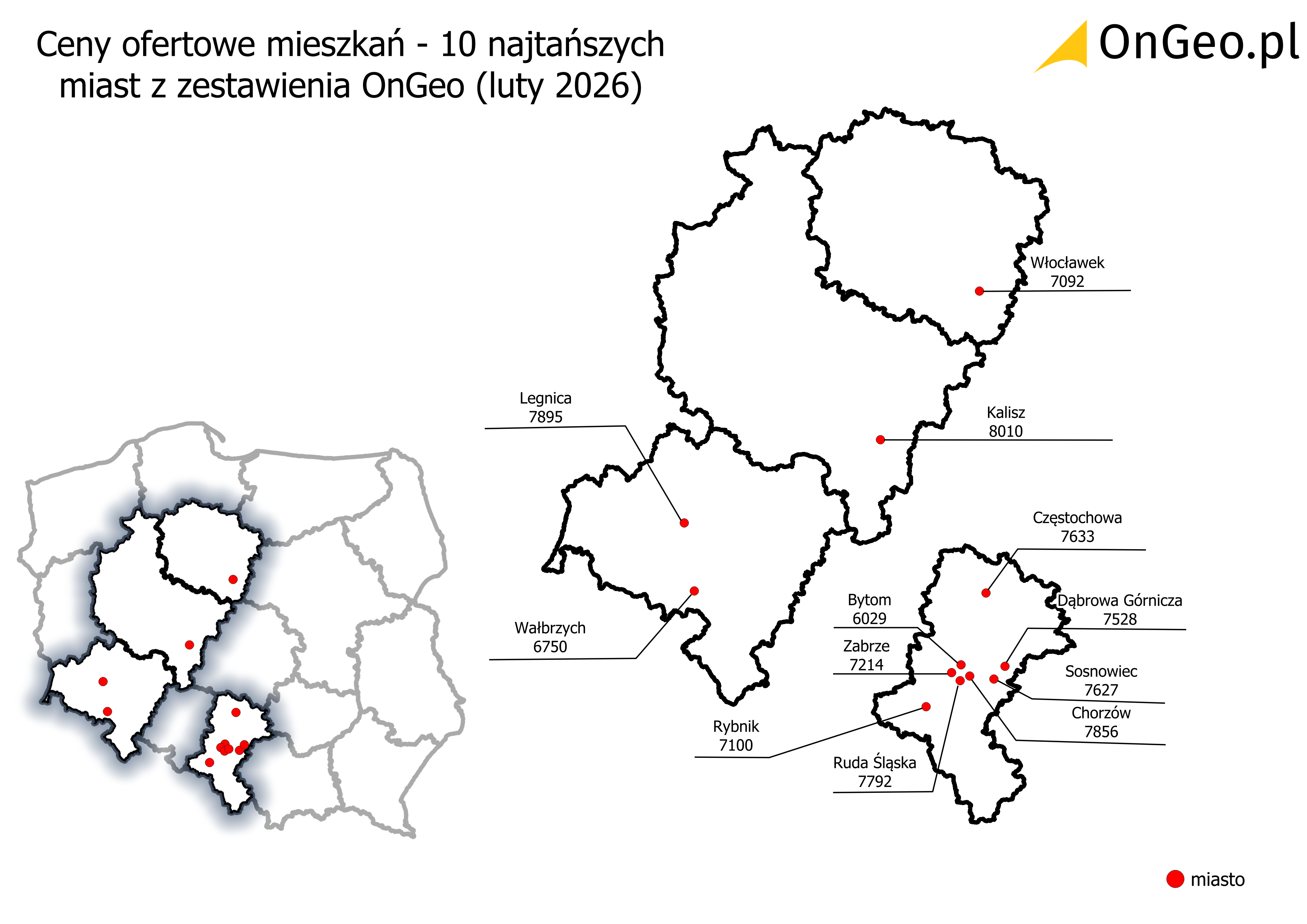 Osiem z dziesięciu najtańszych miast w zestawieniu to ośrodki z południa Polski - siedem leży na Śląsku lub w jego bezpośrednim sąsiedztwie. Jedyne wyjątki to Kalisz (Wielkopolska Wschodnia), Włocławek (Kujawy) i Wałbrzych (Dolny Śląsk). Kalisz z ceną nieznacznie powyżej progu 8 000 zł znalazł się w zestawieniu ze względu na interesujący profil rynku.
