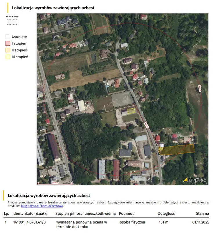 I tu dochodzimy do momentu, w którym dane przestrzenne robią ogromną różnicę. W Raporcie o terenie OnGeo.pl znajduje się osobna sekcja poświęcona lokalizacji wyrobów zawierających azbest. Analiza obejmuje obszar do 200 m od wybranego terenu i pokazuje m.in. dachy, rury, drogi czy składowiska, a także informację, czy azbest został już usunięty, czy nadal stanowi problem.