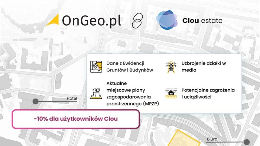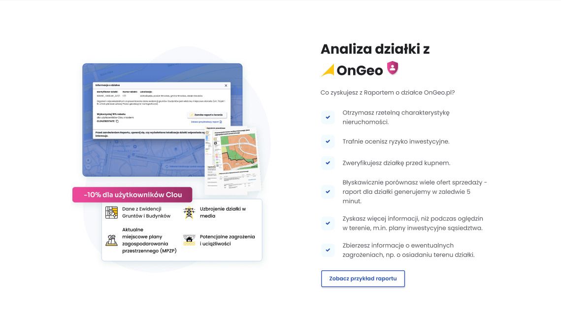 - Dzięki integracji z OnGeo.pl, użytkownicy Clou.estate otrzymują kod rabatowy -10% na każdy raport.