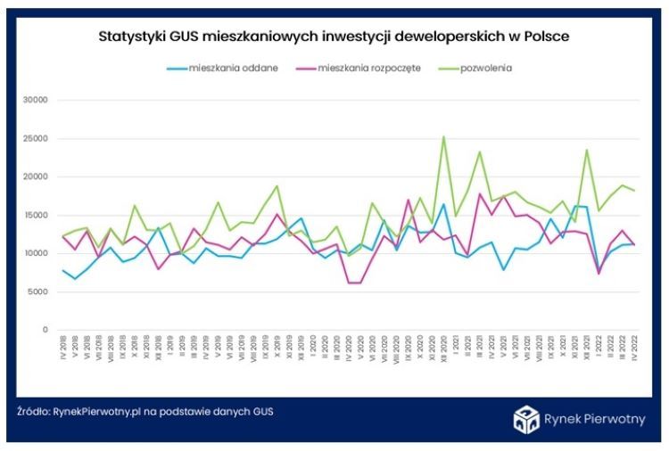 - Kwiecień 2022 r. przynosi kontynuację tendencji hamowania GUS-owskich statystyk pierwotnego rynku mieszkaniowego. Najwyraźniej widać to w kategorii mieszkań rozpoczętych, dotyczących nowych pozwoleń na budowę.