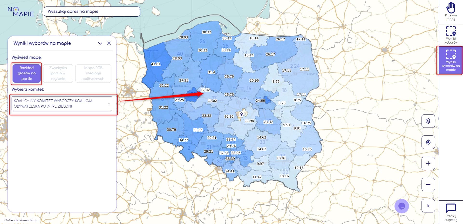 Skorzystaj z narzędzia “Wyniki wyborów na mapie”, aby wyświetlić Rozkład głosów na poszczególne partie.