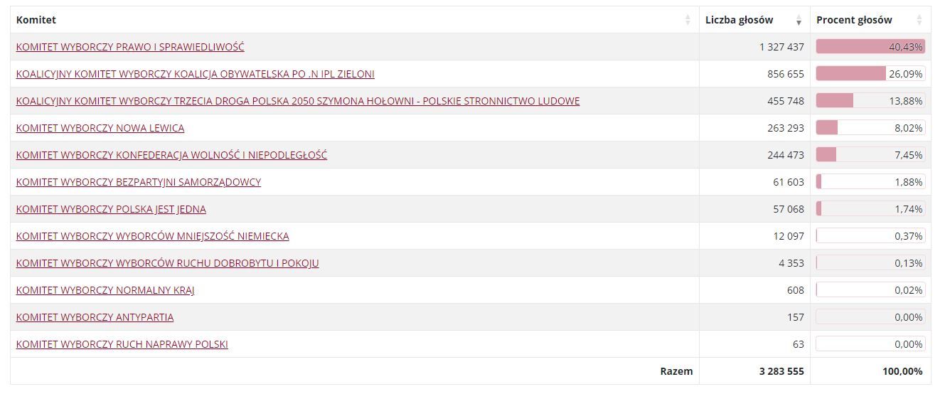 PKW publikuje wyniki liczenia głosów już z ponad 20% obwodów. Wyniki są znacząco różne niż obydwa sondaże exit poll i late poll. Wg. PKW PiS przekracza próg 40% głosów a KO osiąga jedynie 26%. Na trzecim miejscu znajduje się Trzecia Droga z wynikiem prawie 14%. Co ciekawe w niektórych okręgach wyborczych Trzecia Droga znalazła się na drugim miejscu po PiS wyprzedzając Koalicję obywatelską.