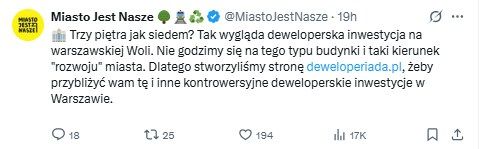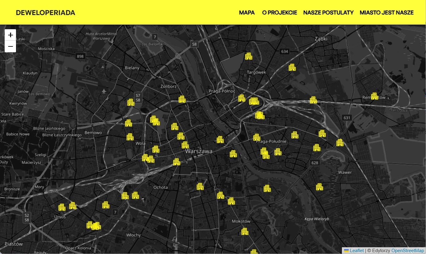 - Stowarzyszenie Miasto Jest Nasze uruchomiło platformę „Deweloperiada” z mapą problematycznych inwestycji deweloperskich w Warszawie.