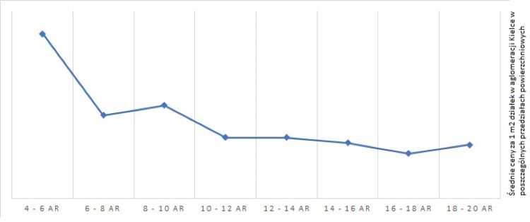 Powierzchnia działki [ar] | Średnia cena za m2 [zł/m2] | Ilość ogłoszeń w przedziale |