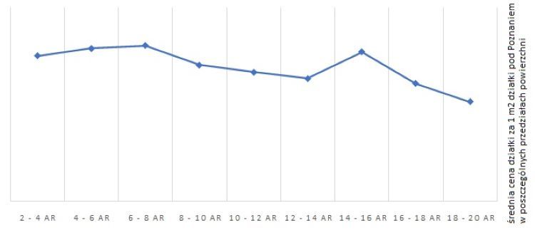 Średnia cena za metr kwadratowy uzależniona jest od lokalizacji, a także powierzchni działki na sprzedaż. Cena średnia za 1 m2 wszystkich wystawionych działek na sprzedaż wynosi 196 zł/m2. Cena działek (średnio) w tym przedziale 8 - 10 arów wynosi 211 zł/m2, natomiast w przedziale 10 - 12 arów - 200 zł/m2. Najwyższa cena za 1 m2 działki wynosiła aż 3 029 zł/m2 (cena 499 900 zł). Działka znajduje się w Kórniku koło Poznania i z pewnością jest inwestycyjna, ponieważ jej powierzchnia wynosi zaledwie 165 m2.