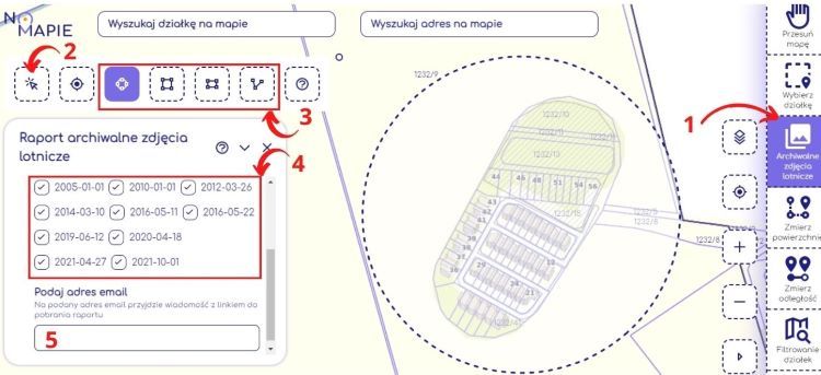 - Uzupełnij formularz, a następnie wybierz interesujące cię lata wykonania zdjęć lotniczych (4). Podaj adres e-mail, na który nasz automat wyśle twój raport (5). Zaakceptuj wymagane zgody, a potem kliknij przycisk "Opłać raport: 49 zł".
