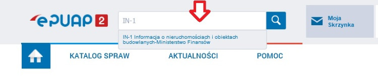 - jeśli nie masz założonego konta na na epuap, możesz to zrobić klikając w odnośnik znajdujący po na dole ekranu, po lewej stronie na niebieskim tle „Zarejestruj się” - Po zalogowaniu się wyszukaj w wyszukiwarce (przy lupie) hasło: „IN-1”.