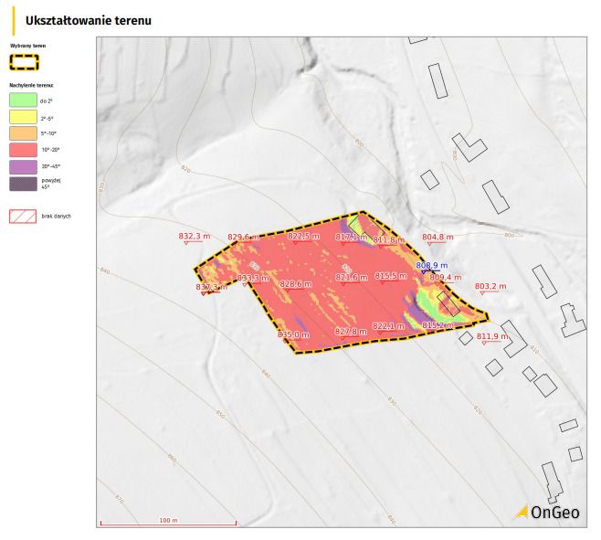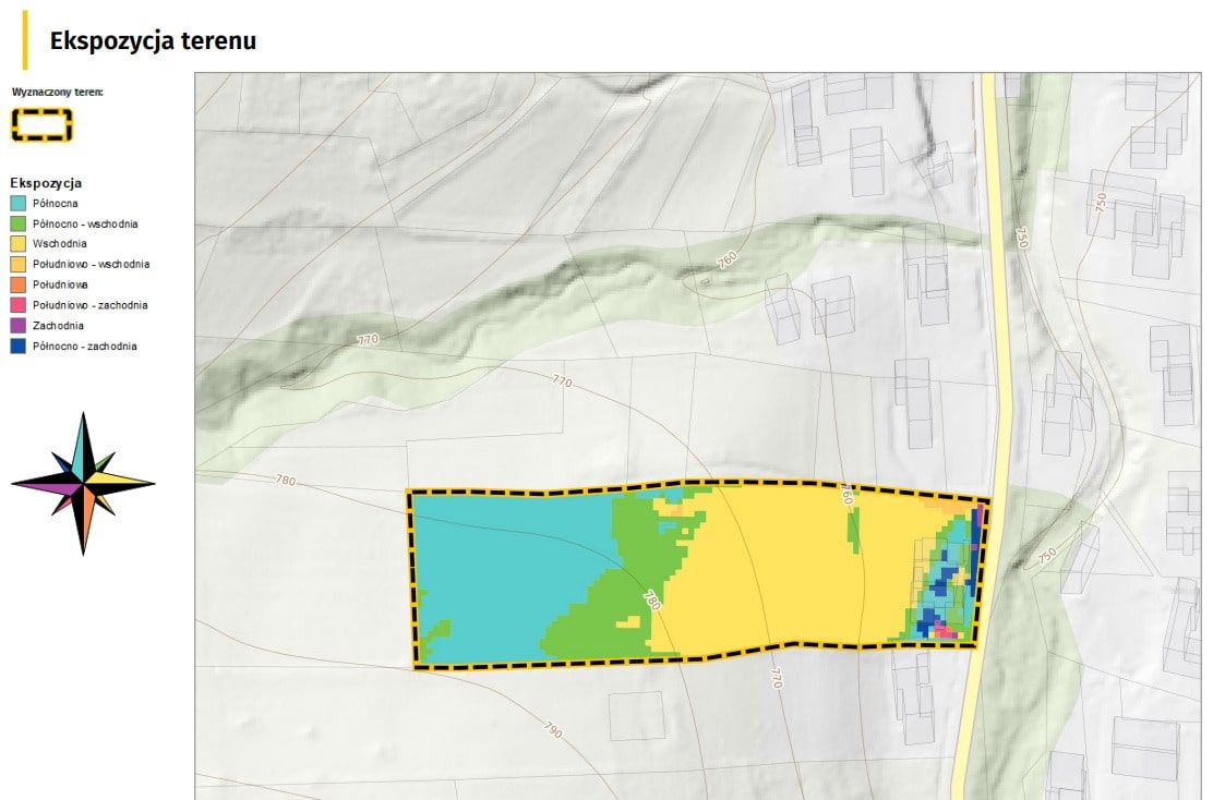 - Teren opada z SW na NE, co oznacza, że główny stok jest wystawiony na kierunki północno-wschodnie. To kluczowa informacja.