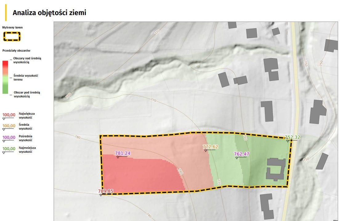 Dane z raportu: Analiza objętości wskazuje, że wyrównanie terenu do średniej wysokości (772,6 m) wymagałoby przemieszczenia ponad 64 000 m³ ziemi!