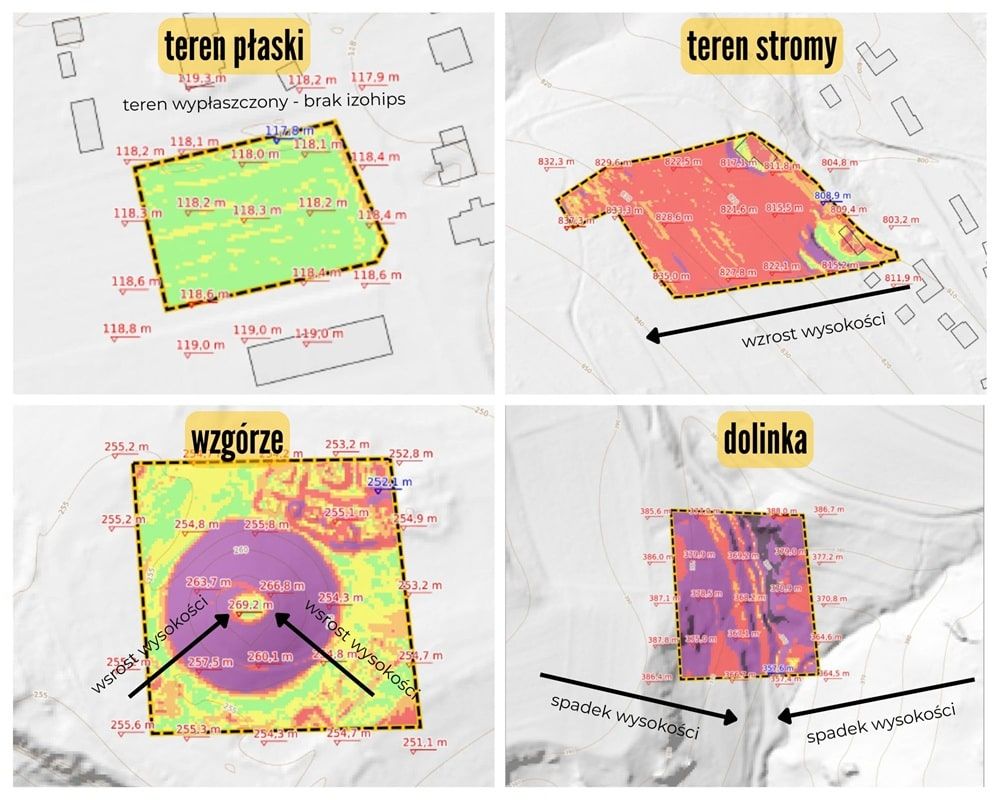 - Aby w pełni zrozumieć ukształtowanie terenu działki, niezbędna jest analiza izohips, czyli krzywych linii na mapie łączących punkty o takiej samej wysokości względem przyjętego poziomu odniesienia, najczęściej nad poziomem morza.