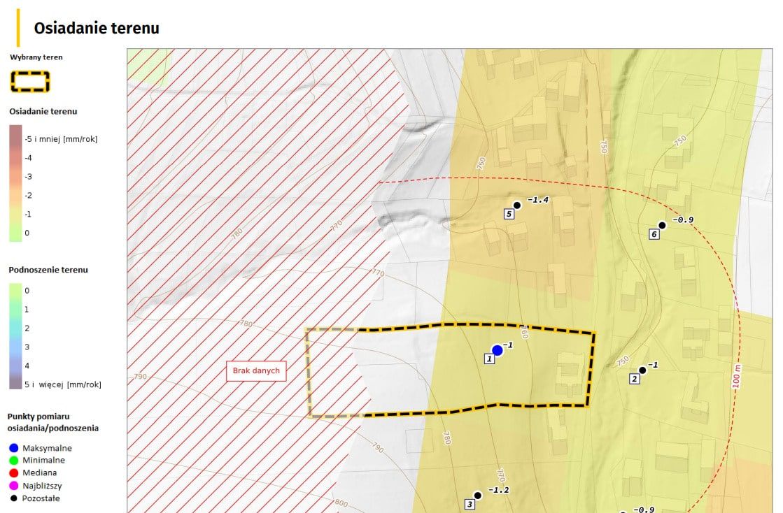 Dane z raportu: Teren wykazuje tendencję do osiadania (ok. -1 mm/rok). Co ważniejsze, w pobliżu (228 m) znajduje się aktywne osuwisko, a w dalszej odległości kolejne strefy osuwiskowe.