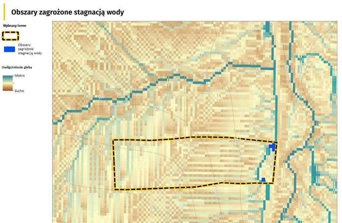 Dane z raportu: Wykryto niewielki obszar zagrożony stagnacją wody w północno-wschodniej, najniższej części działki.