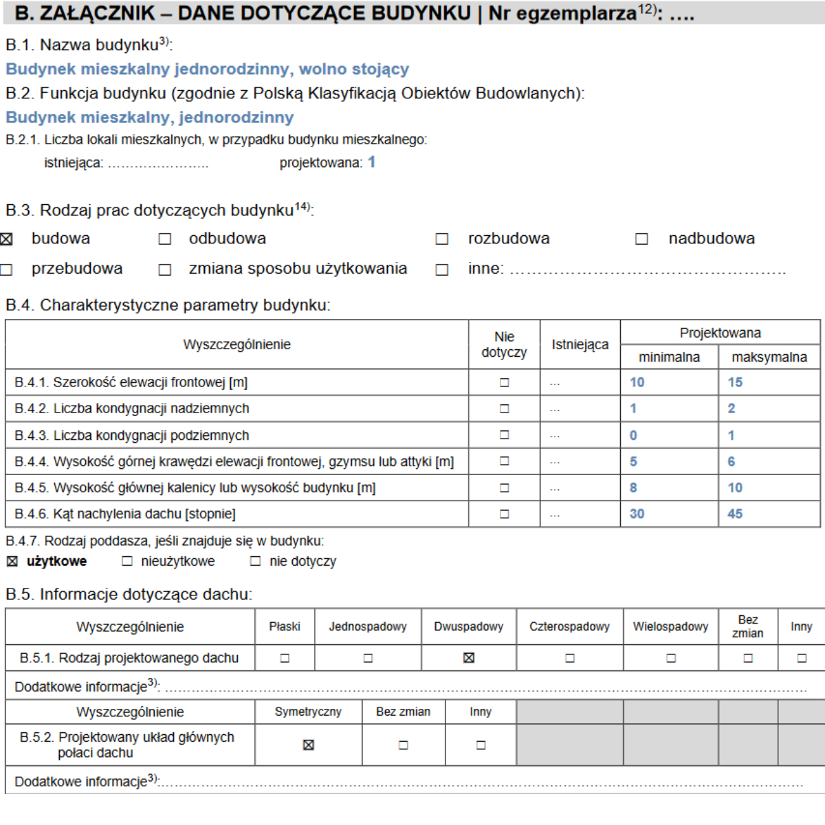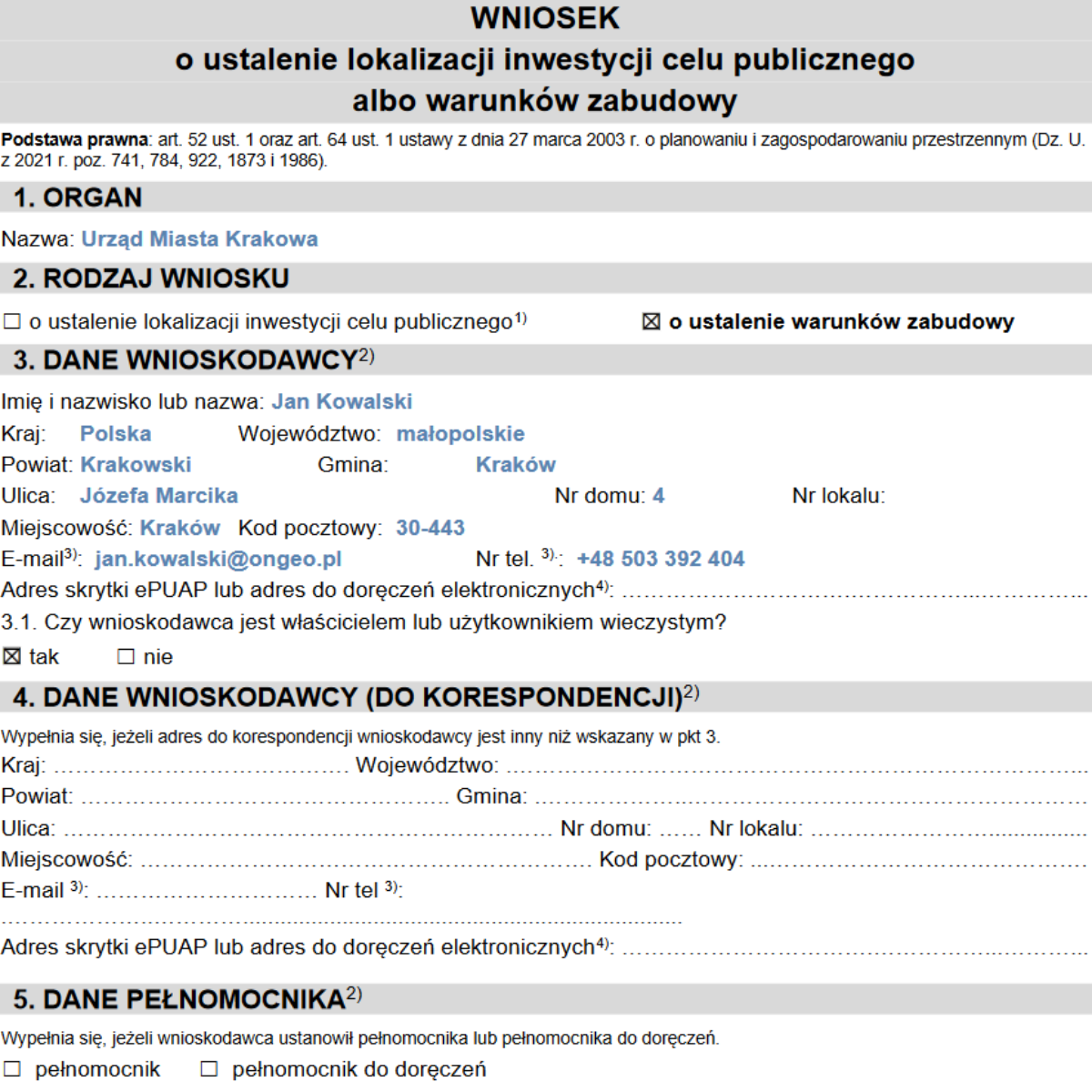 Poniżej prezentujemy wypełniony wniosek o ustalenie warunków zabudowy. Szablon wniosku został pobrany ze strony www.biznes.gov.pl, właściwy link do wzoru dokumentu znajduje się w dalszej części artykułu. Jeżeli nie wiesz jak wypełnić wniosek o warunki zabudowy zapoznaj się z poniższym przykładem.