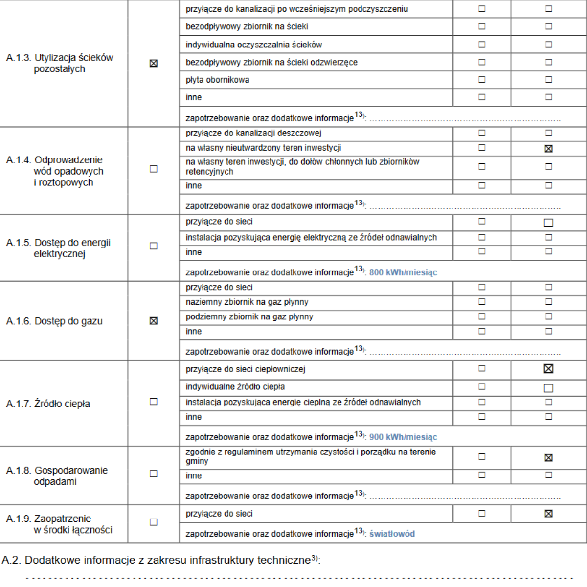 zapotrzebowanie w zakresie infrastruktury technicznej: woda, energia elektryczna, gaz, centralne ogrzewanie, odprowadzanie lub oczyszczanie ścieków, unieszkodliwianie odpadów,