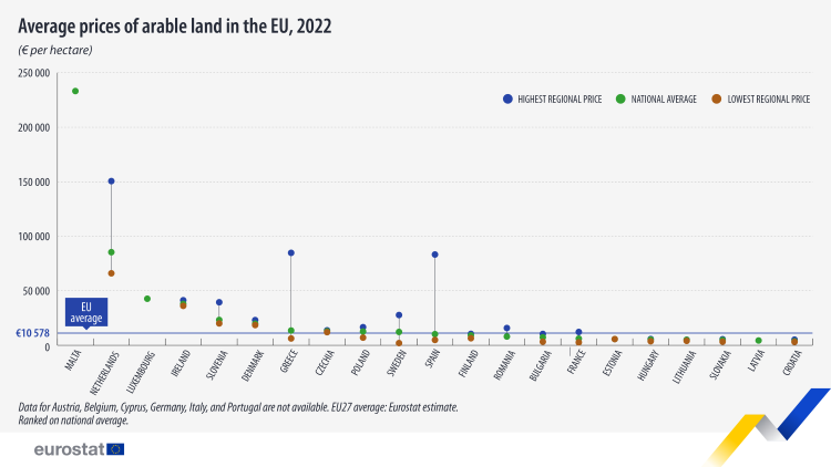 W Holandii ceny wahały się od 66 051 euro we Fryzji do 150 644 euro we Flevoland, przy średniej krajowej wynoszącej 85 431 euro za hektar. W Grecji natomiast ceny wahały się od 6 290 euro w Dytiki Ellada do 84 820 euro w Attiki, przy średniej krajowej wynoszącej 13 571 euro za hektar. W Hiszpanii ceny wahały się od 4 906 euro w Estremadurze do 83 299 euro na Wyspach Kanaryjskich, przy średniej krajowej wynoszącej 10 263 euro za hektar. Najtańszymi regionami, w których można kupić 1 hektar gruntów ornych w 2022 r., były Övre Norrland (średnio 2041 euro) i Mellersta Norrland (2437 euro) w Szwecji.