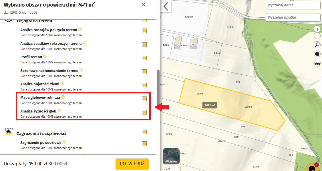 Zaznacz cechy terenu, które chciałbyś pobrać dla swojej działki, a następnie wybierz Mapa glebowo-rolnicza i Analiza żyzności gleb z zakładki Fizjografia terenu.