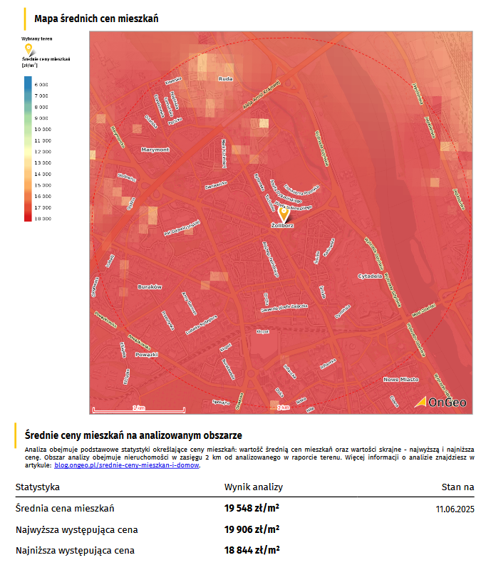 Raport o Terenie OnGeo.pl - Mapa średnich cen mieszkań dla Żoliborz Warszawa (zasięg 2 km)