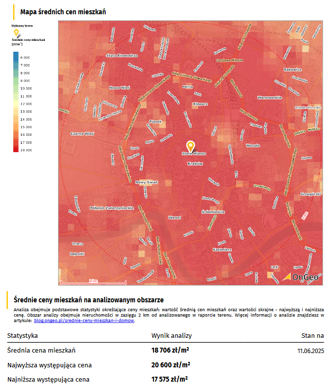 Raport o Terenie OnGeo.pl - Mapa średnich cen mieszkań dla Starego Miasta Kraków (zasięg 2 km)
