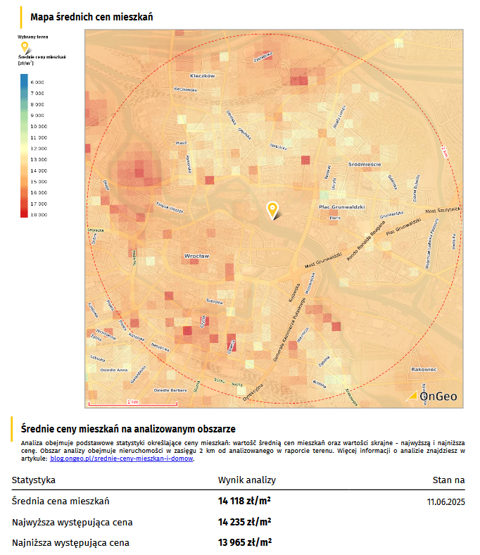 Raport o Terenie OnGeo.pl - Mapa średnich cen mieszkań dla Śródmieścia Wrocław (zasięg 2 km)