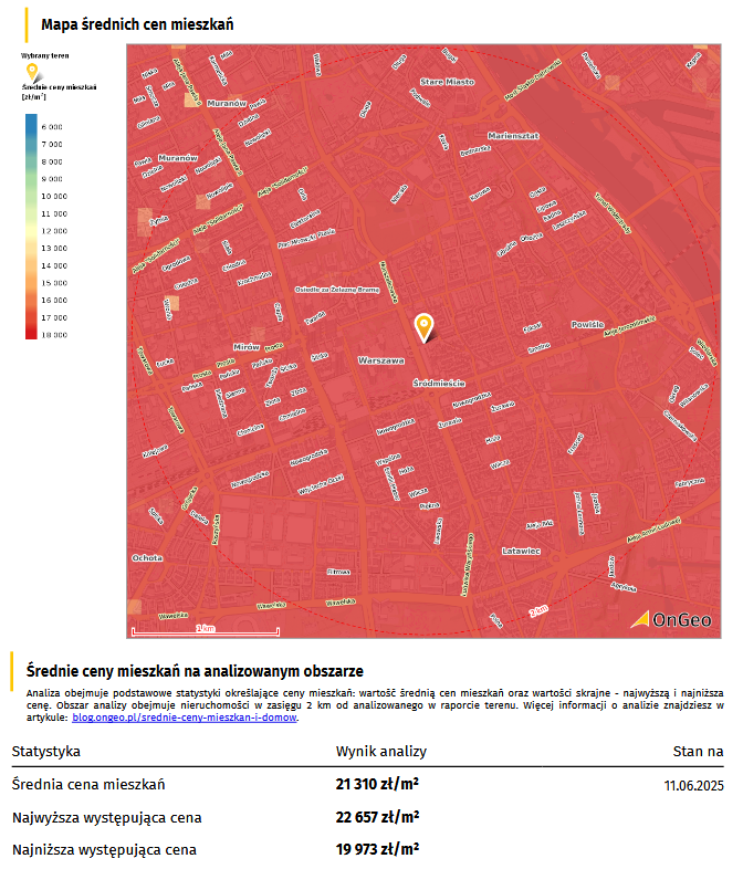Raport o Terenie OnGeo.pl - Mapa średnich cen mieszkań dla Śródmieścia Warszawa (zasięg 2 km)