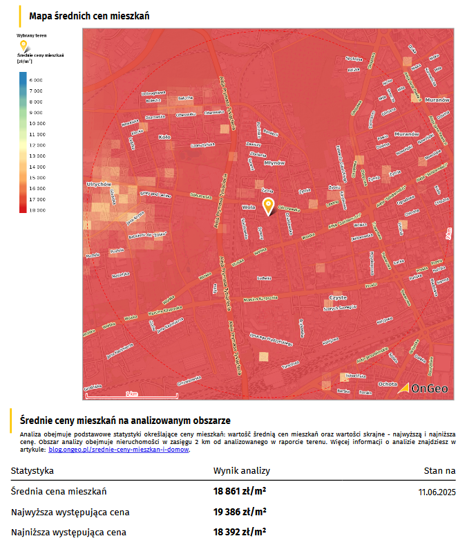 Raport o Terenie OnGeo.pl - Mapa średnich cen mieszkań dla Wola Warszawa (zasięg 2 km)