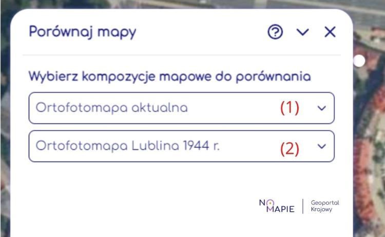 - Wybierz dwie kompozycje mapowe do porównania. Jeśli chcesz porównać ortofotomapy historyczną i aktualną wybierz: “Ortofotomapa aktualna” (1) i “Ortofotomapa 1944 r.” (2).