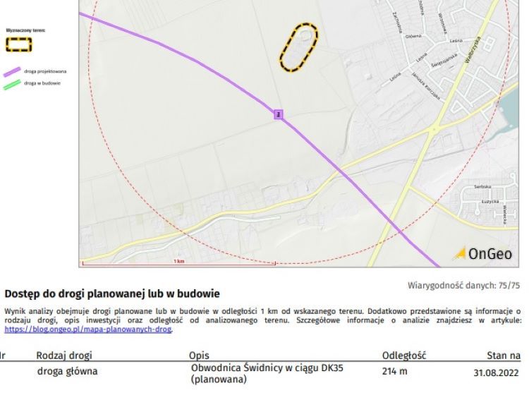 Przede wszystkim warto zauważyć, że w odległości ok. 214 m od działki planuje się budowa obwodnicy miasta Świdnica. Tak mała odległość od zabudowań spowoduje zwiększenie hałasu, jak również zanieczyszczenia pochodzącego ze spalin. Oczywiście warto mieć na uwadze, że zgodnie z Ustawą o drogach publicznych z 1985 r. odległość od :