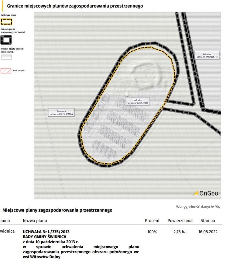 - W OnGeo.pl zdiagnozowaliśmy działkę pod kątem zagrożeń, uciążliwości i ograniczeń formalnoprawnych. Wygenerowaliśmy zbiorczy Raport o Terenie dla działek na których powstało osiedle w Witoszowie. Sprawdź w dalszej części artykułu.