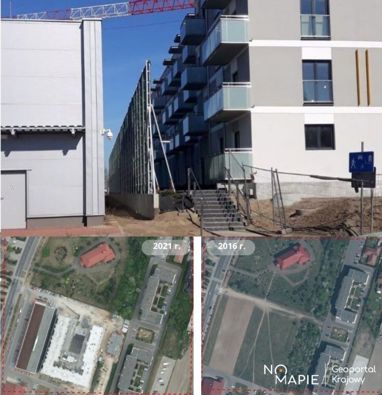 Poniższe zdjęcie przedstawia samą inwestycję od strony o ograniczonym dostępie światła, a poniżej mamy porównanie archiwalnej i obecnej ortofotomapy przedstawiającej ten teren. Jaki widać, jeszcze w 2016 roku nie było żadnych śladów, że w tym miejscu ma powstać tak bezsensowna inwestycja.