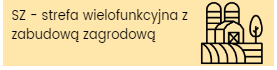 | 3 | SZ | strefa wielofunkcyjna z zabudową zagrodową | teren zabudowy zagrodowej, teren produkcji w gospodarstwach rolnych, teren akwakultury i obsługi rybactwa, teren komunikacji, teren zieleni urządzonej, teren infrastruktury technicznej | teren wielkotowarowej produkcji rolnej, teren rolnictwa z zakazem zabudowy, teren biogazowni, teren usług, teren zieleni naturalnej, teren lasu, teren wód | 30 |