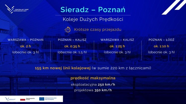 Spółka Centralny Port Komunikacyjny zaprezentowała wariant inwestycyjny dla odcinka Kolei Dużych Prędkości między Poznaniem, Kaliszem i Sieradzem. Odcinek ten będzie częścią kolejowej "igreki" Warszawa-Łódź-Wrocław/Poznań, co skróci czas podróży pociągiem między Poznaniem a Warszawą o ponad godzinę. Projekt jest częścią unijnej sieci priorytetów transportowych TEN-T.