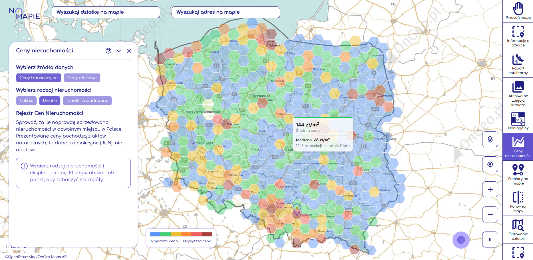 Po wybraniu cen transakcyjnych mapa pokrywa się siatką heksagonów - kolorowanych według legendy skali od najniższych do najwyższych cen w danym obszarze. Jeden klik w heksagon wyświetla trzy wartości: średnią cenę za m², medianę oraz liczbę transakcji z ostatnich dwóch lat.