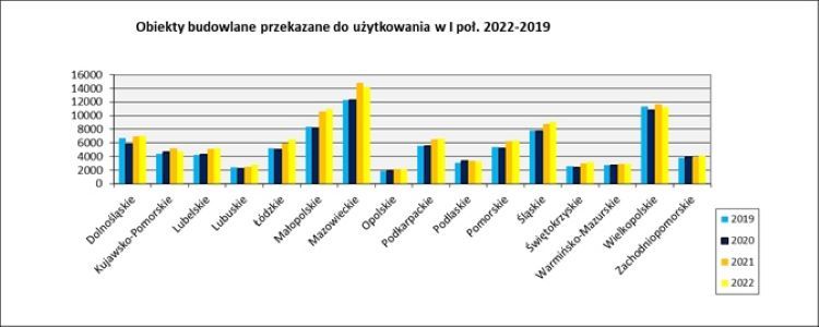 Do użytkowania przekazano 100 213 obiektów budowlanych. W stosunku do I poł. 2021 r. (99 624) jest to wzrost o 0,6 %, do I pół. 2020 roku (86 035 obiektów) - wzrost o 16,5 %. Wśród obiektów oddanych do użytkowania ponad połowę stanowią budynki jednorodzinne - 55 551. Jest to więcej niż w analogicznym okresie 2021 r. (52 501), 2020 r. (42 265) oraz więcej niż w I połowie 2019 r. (41 760).