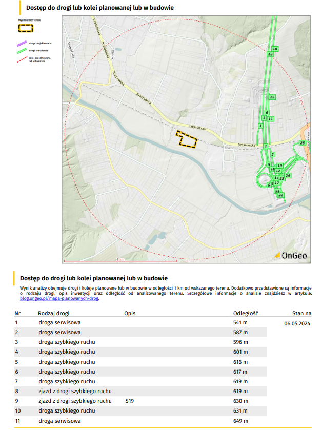 Analiza wykonywana jest w zasięgu 1 km od wskazanego w Raporcie o terenie obszaru. Dodatkowo przedstawione są informacje dotyczące rodzaju drogi, opis inwestycji oraz odległość od analizowanego terenu.