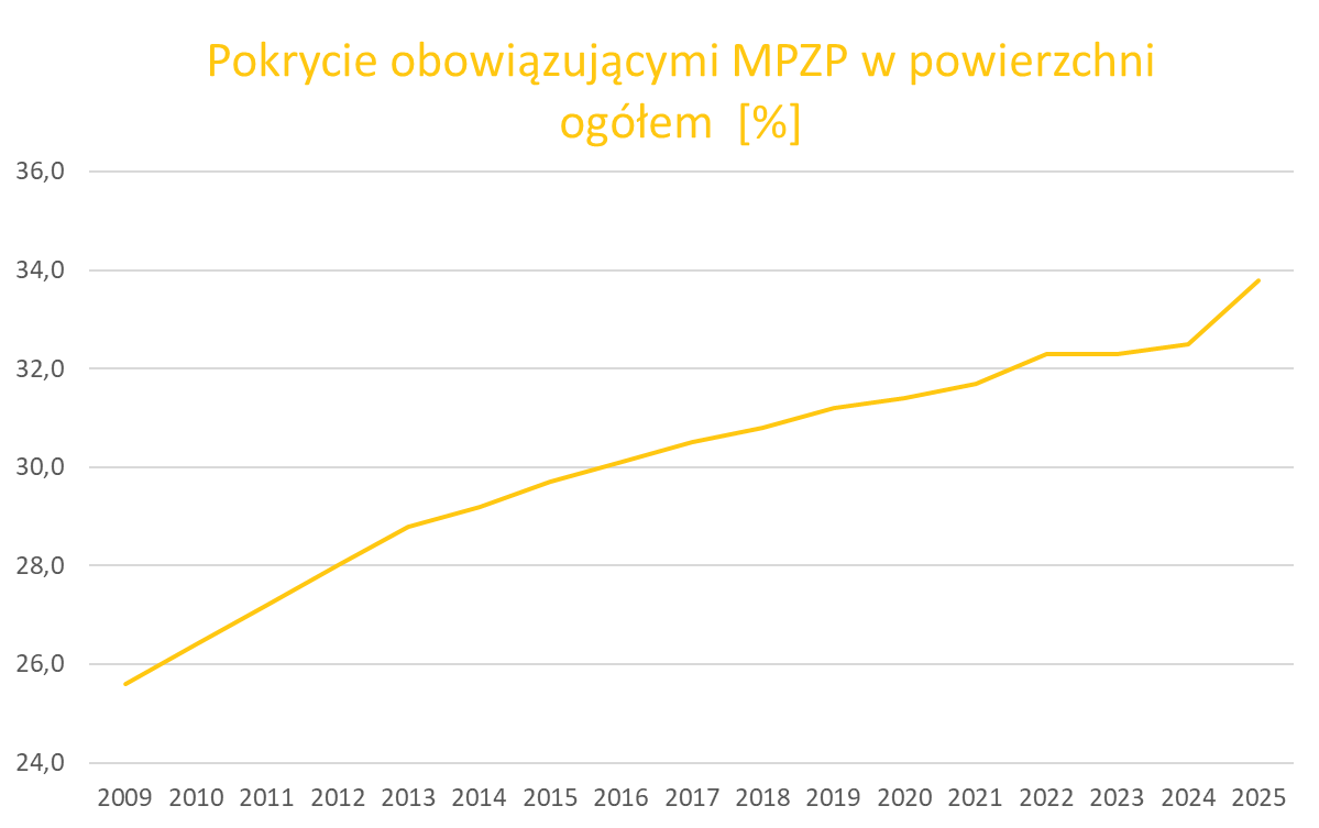 Analiza danych z lat 2009–2025 r. pokazuje powolny, ale systematyczny wzrost pokrycia kraju miejscowymi planami zagospodarowania przestrzennego: