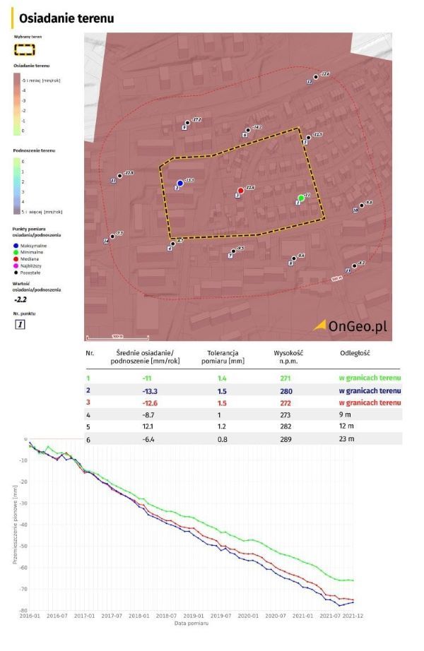 - W Raporcie o terenie OnGeo.pl otrzymasz mapę osiadania terenu a także tabelaryczne zestawienie najważniejszych parametrów dotyczących wybranego obszaru