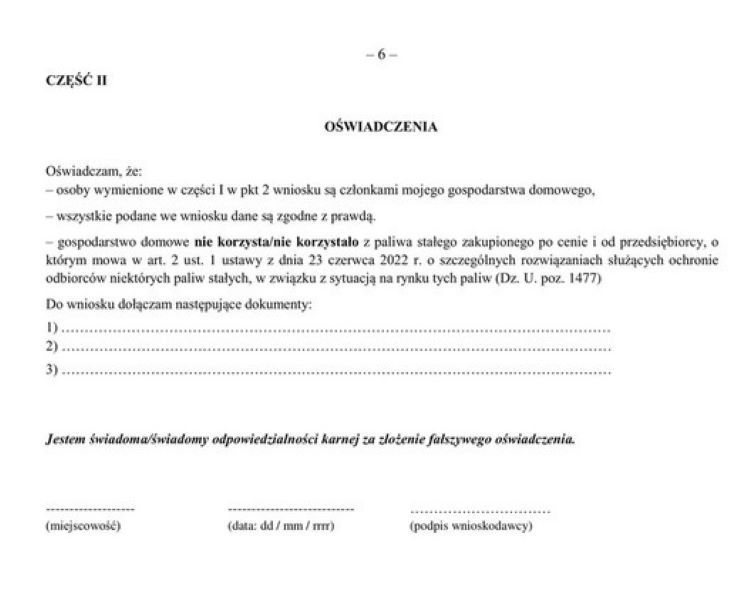 Złożenie wniosku o wypłatę dodatku węglowego wymaga także zapoznania się z pouczeniem, że informacje składa się pod rygorem odpowiedzialności karnej za składanie fałszywych zeznań.