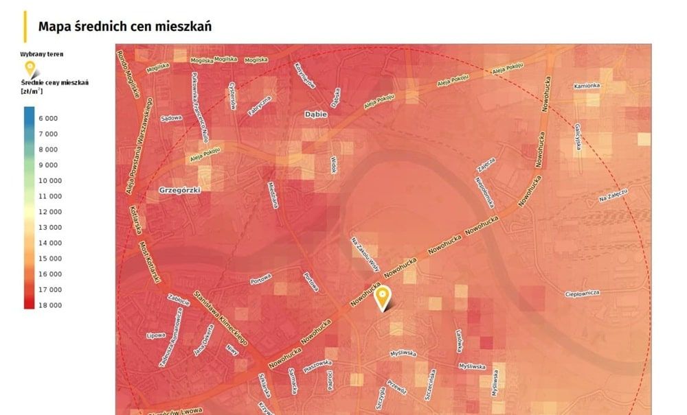 - Mapę prezentującą średnie ceny mieszkań na obszarze 2 km od analizowanego terenu, umożliwiającą szybką wizualną identyfikację lokalizacji o najwyższych i najniższych cenach.